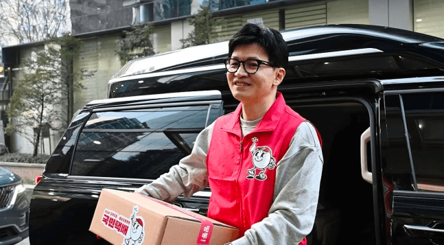 각인된 옷을 입고 ‘국민택배’ 상자를 들고 공약